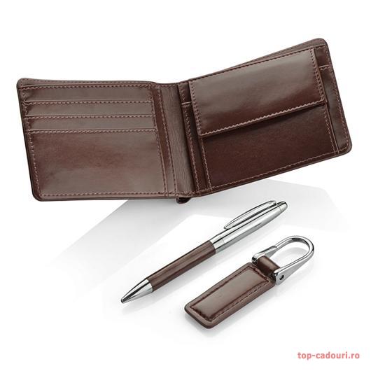 Un set elegant, format dintr-un portofel, breloc si pix, atent lucrate in piele ecologica.