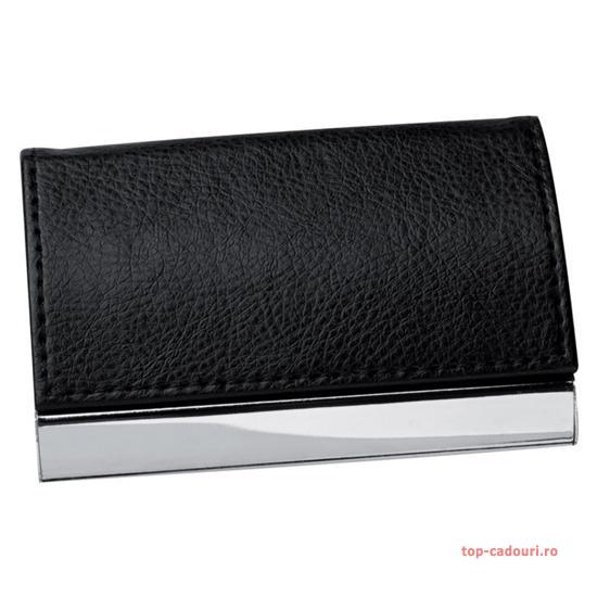 Port visit card de calitate superioara, cu suprafete metalice lucioase cromate, invelit in imitatie de piele neagra.