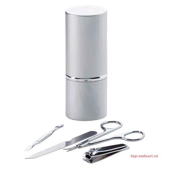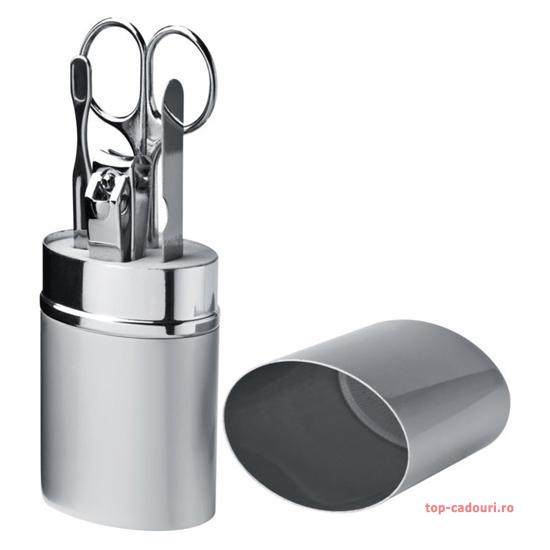 Setul de manichiura contine patru piese si se livreaza in cutie metalica cu accesorii cromate.